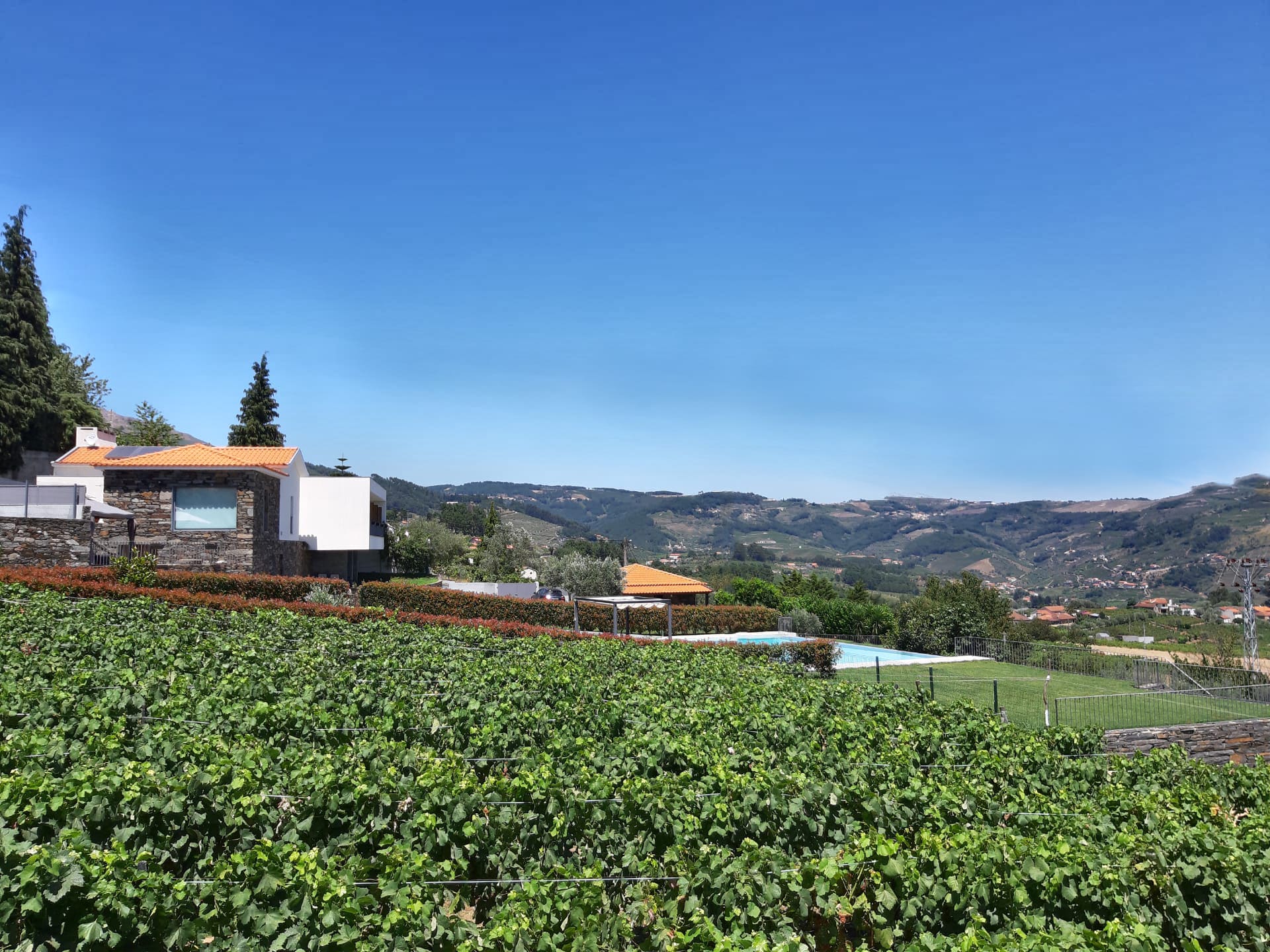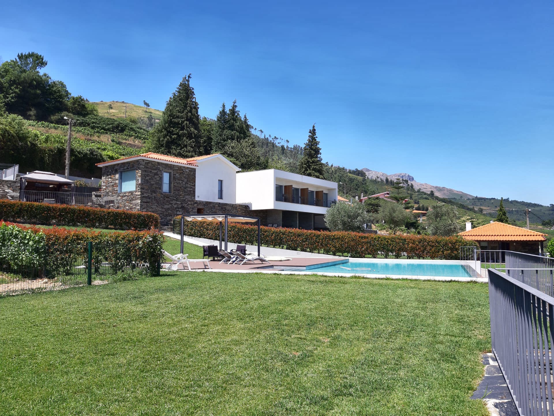 Amplos espaços exteriores e relvados. Com uma área exterior com cerca de 9000m2, incluindo as vinhas, dispõe também de uma piscina exterior totalmente vedada para maior segurança.